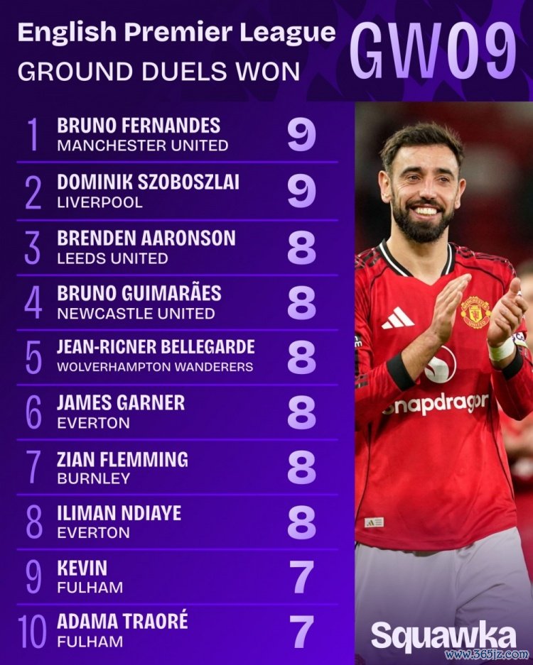 10月28日讯 英超联赛第9轮依然完赛,数据机构squawka统计了本轮大地叛逆见效次数,曼联队长B费和利物浦中场索博斯洛伊并排居首。
