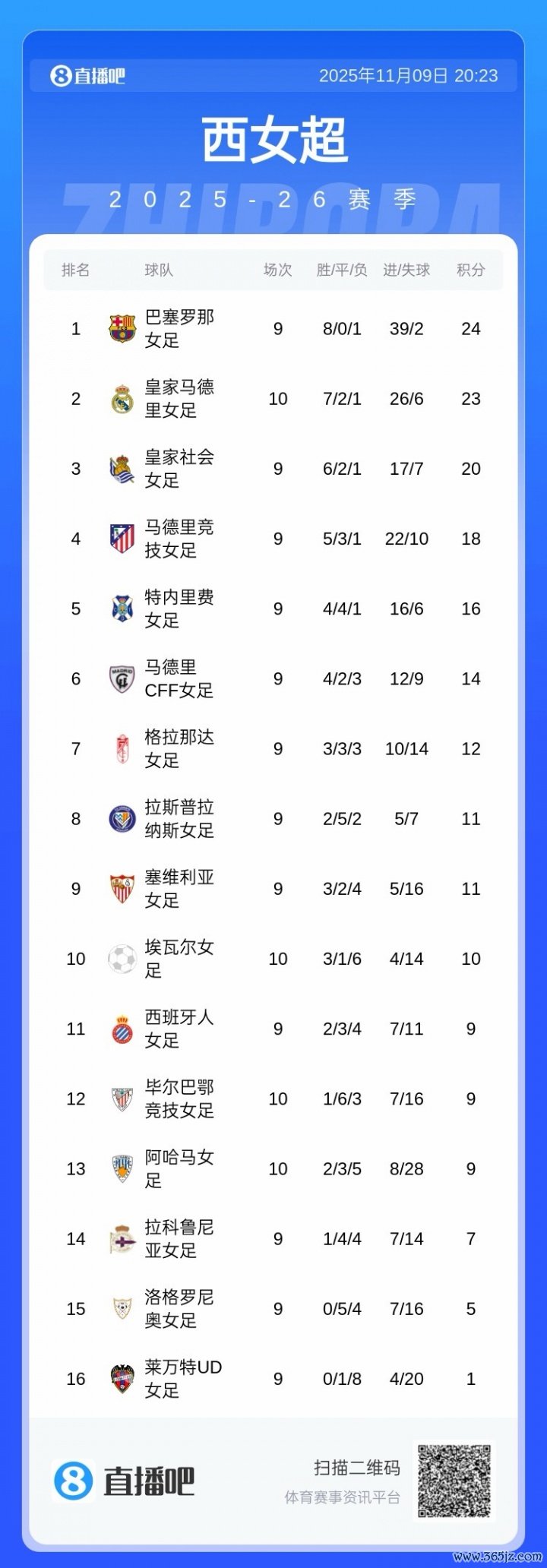 值得一提的是,巴萨女足现在也排在联赛积分榜榜首,此前9轮8胜1负,狂进39球仅丢2球,暂时杰出先赛一场的皇马女足1分。