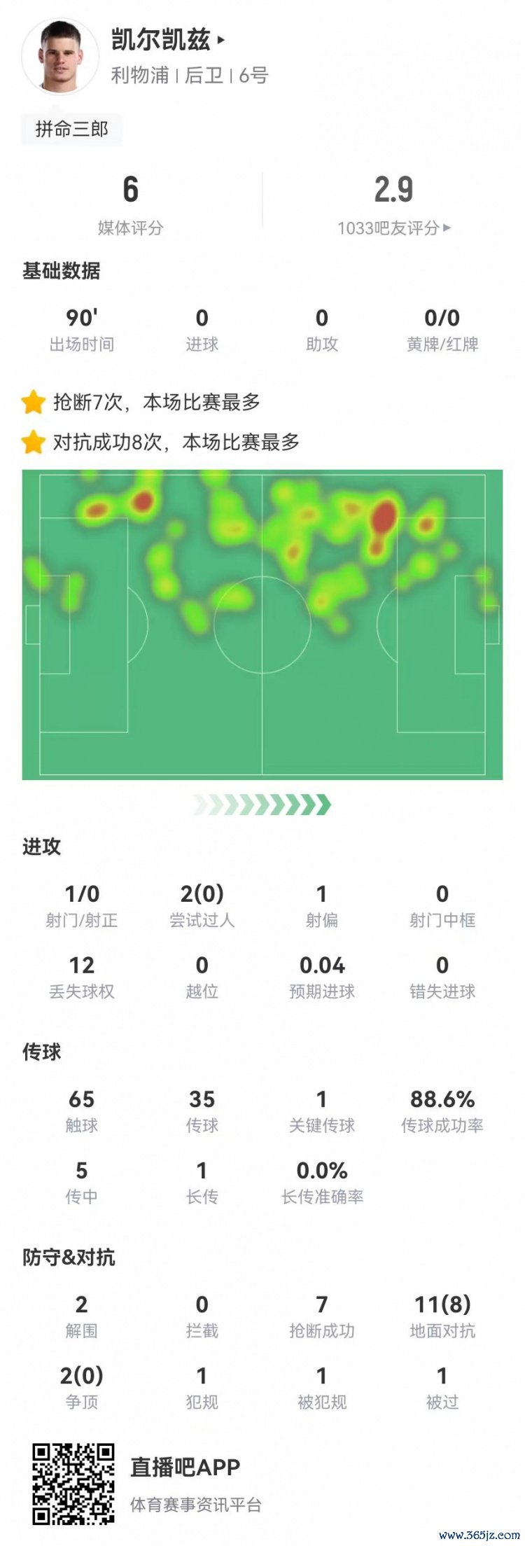 11月27日讯 利物浦在本轮欧冠1-4惨败埃因霍温,凯尔凯兹本场数据如下: