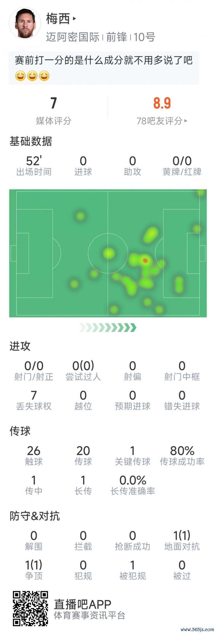 11月30日讯 好意思职联分区决赛半场战罢,迈阿密国外2-1向上纽约城,以下为梅西半场数据: