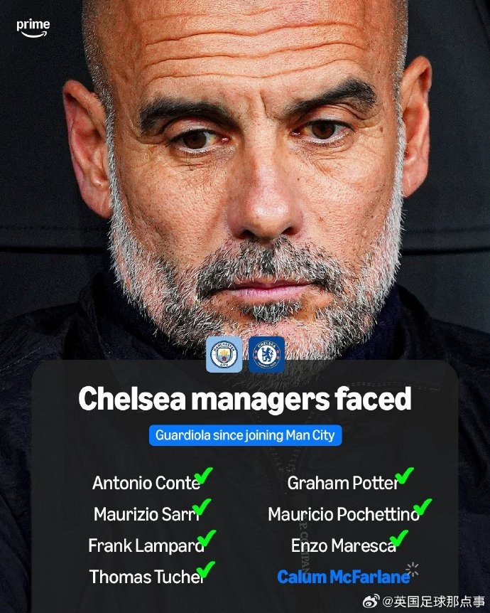 Prime Sport:自2016年握教曼城以来,瓜迪奥拉一经与八位切尔西主帅交过手🤯