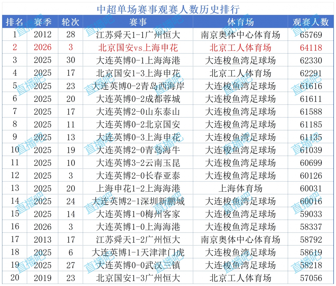 03月21日讯 国安本场赛事迎战申花,下间歇时间时间球场广播人数,本场对决共有64118人现场观战,打破工体上座纪录,赛季排名次序中超历史第2!