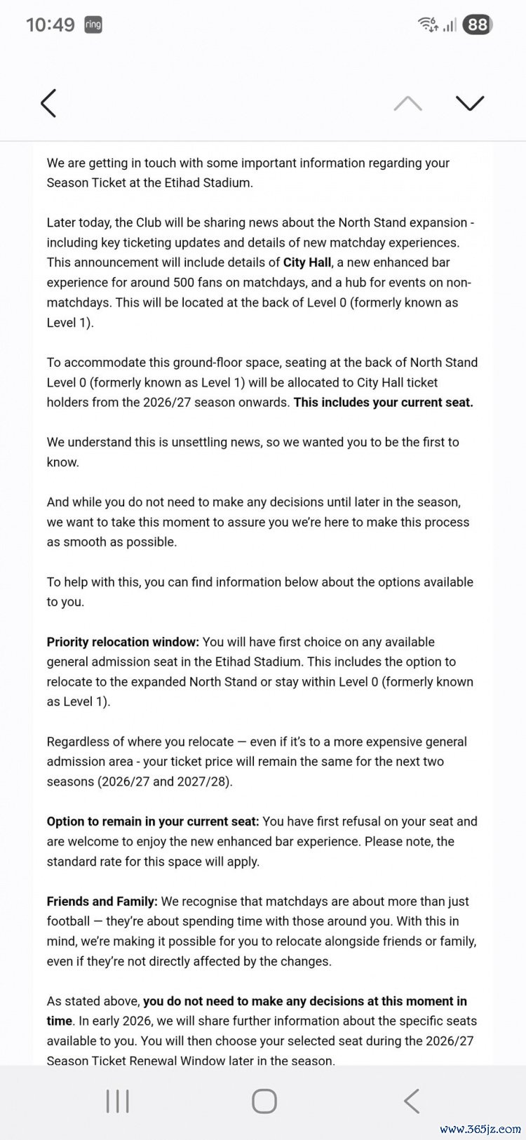 曼城俱乐部已见告部分季票捏有者,由于北看台扩建计较,他们面前的座位将受到影响。俱乐部将在北看台0层——原1层——后部新建一个名为“市政厅”City Hall的增强型酒吧体验区及行为中心,该区域从2026/27赛季起将分派给新的捏票东谈主,这径直影响了收到见告球迷的现存座位。