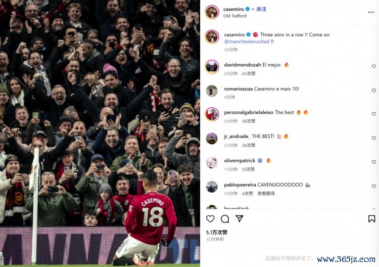 他也在赛后通过社媒晒出我方的滑跪庆祝照,并配文:“三连胜!@曼联,加油!”