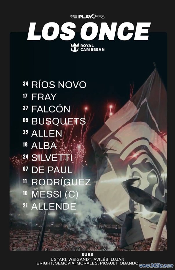 迈阿密海外首发:34-诺沃、17-伊安·弗雷、37-法尔肯、32-阿伦、18-阿尔巴、21-阿连德、7-德保罗、5-布斯克茨、10-梅西、11-B·罗德里格斯、24-西尔维蒂