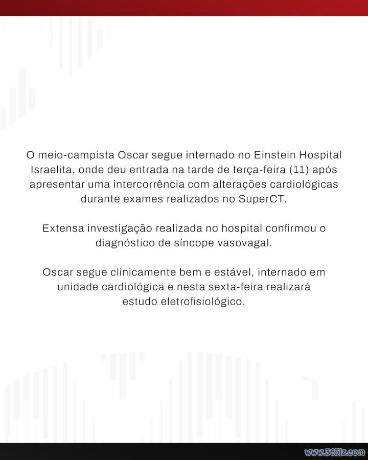 11月14日讯 圣保罗俱乐部官方发布公告,就34岁奥斯卡此前体检时眩晕、腹黑查验特出一事作念出公告。