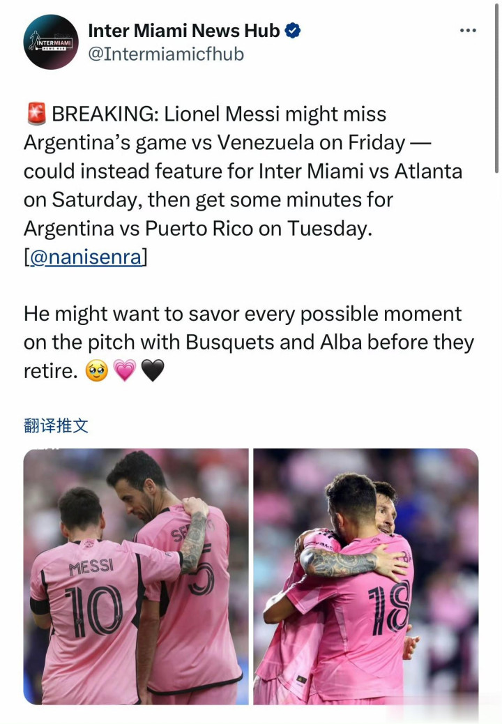 10月9日报谈,据DS体育记者报谈称,梅西可能会缺席阿根廷对阵委内瑞拉的比赛。他或将遴荐在10月12日代表迈阿密出战对阵亚特兰大联比赛中上场,然后鄙人周阿根廷队对阵波多黎各的比赛中取得一些上场时辰。到当今放手这一切都还未细则!