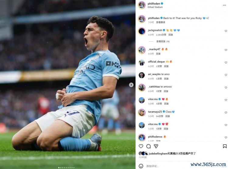 本场比赛福登首开纪录,这亦然他自本年1月以来初次在英超破门,他也在个东谈主社媒晒出滑跪庆祝相片,配文写谈:“重回正轨,进球献给里奇。”