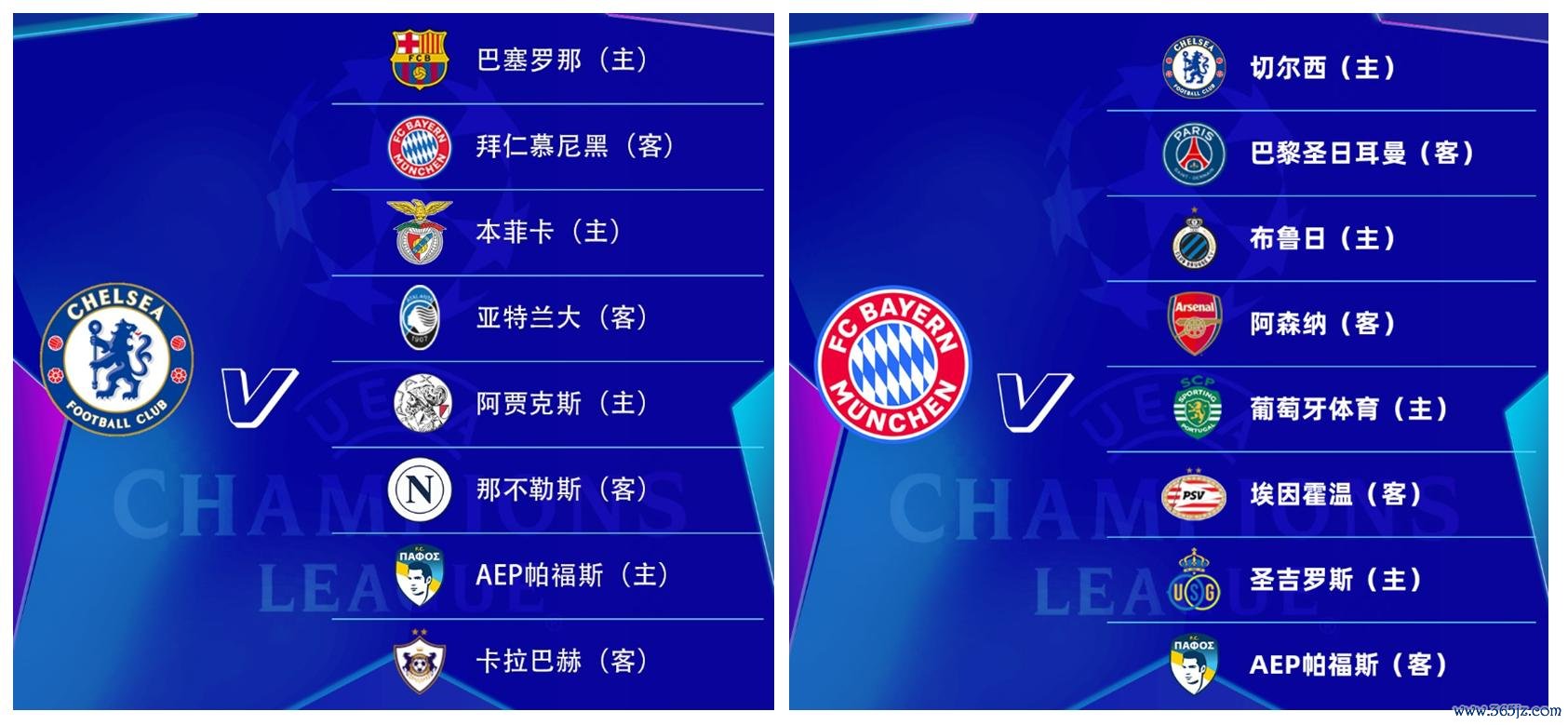 进程抽签,切尔西的八个敌手分袂为拜仁(客)、巴萨(主)、本菲卡(主)、亚特兰大(客)、阿贾克斯(主)、那不勒斯(客)、帕福斯(主)、卡拉巴赫(客),以及拜仁的八个敌手分袂为切尔西(主)、巴黎(客)、布鲁日(主)、阿森纳(客)、葡萄牙体育(主)、埃因霍温(客)、圣吉罗斯(主)、帕福斯(客)。