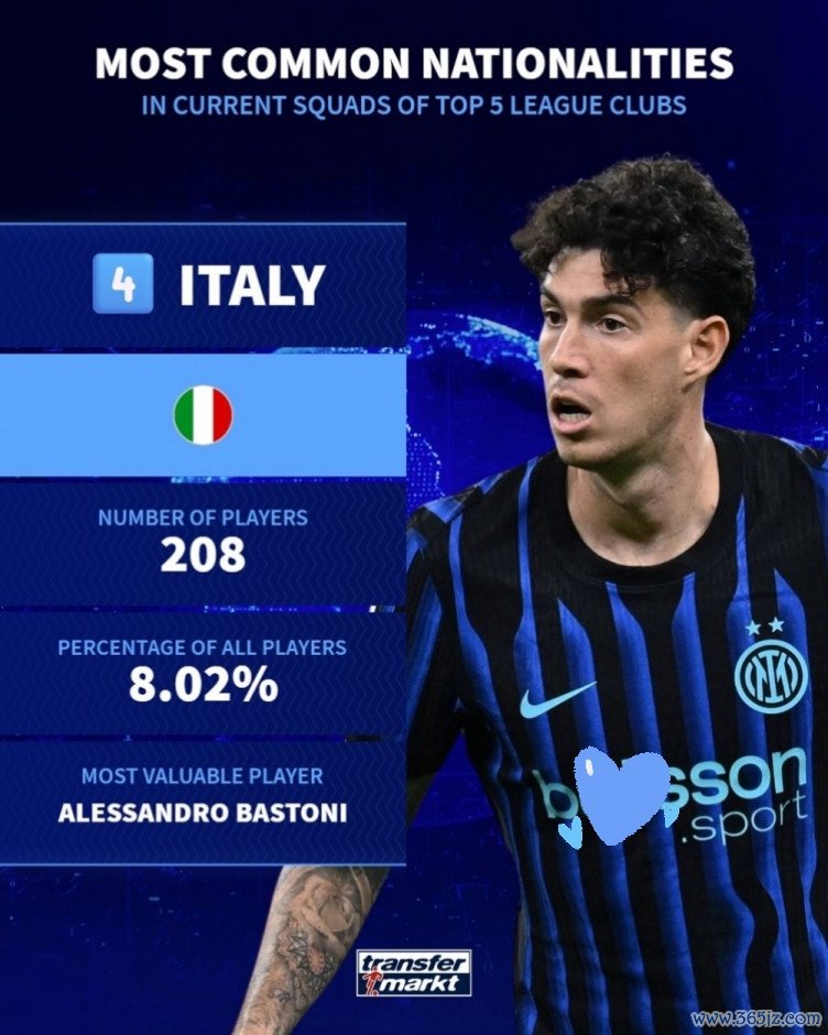 意大利:208东说念主,五大联赛球员意大利>英格兰,如故让东说念主未必的,因为近些意甲没落,也曾成为英超级联赛逾期球星和宿将的养老院。