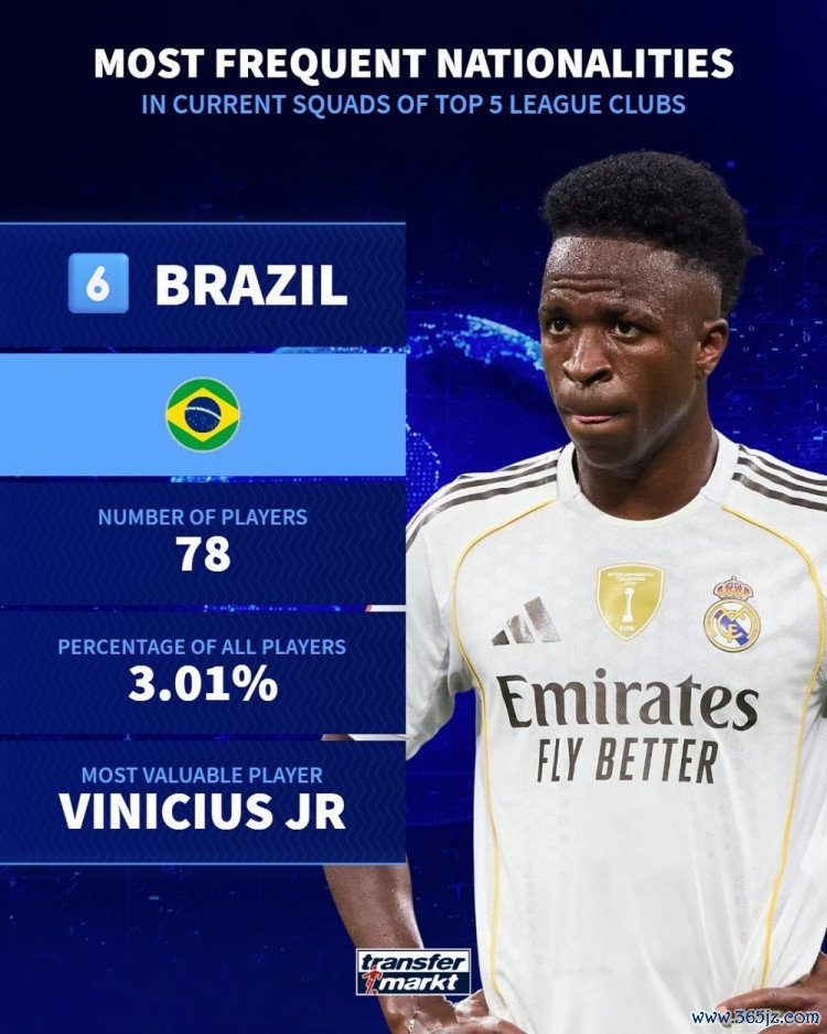 德国转会阛阓统计了欧洲五大联赛列国球员的数目,并排出了一份榜单,效果是西班牙球员随地着花,以337东说念主领跑,法国球员数目名按序二,而英格兰球员仅名按序五有点让东说念主未必,巴西国度队近些年获利拉胯,看来是东说念主才凋零,五大联赛的巴西球员不及100东说念主。