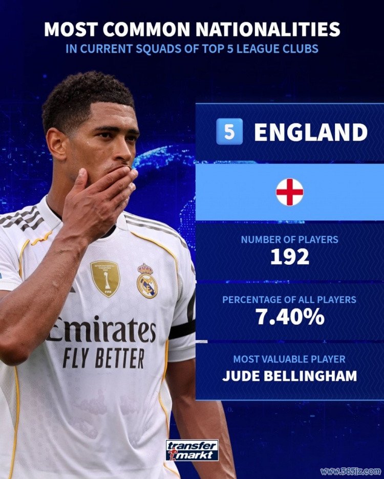 英格兰:192东说念主,英超也曾是第一联赛,为何英格兰球员在五大联赛的数目反而是五大联赛国度最少的呢?英格兰球员基本上辘集在英超联赛,给与去别的五大联赛效率的英格兰球员未几,这是导致英格兰球员无法扩散的主要原因。还有即是英格兰球员多量脚法轻视,愈加合适英式顶住,英格兰球员踢不了英超就会给与踢英冠,而非去别的五大联赛。