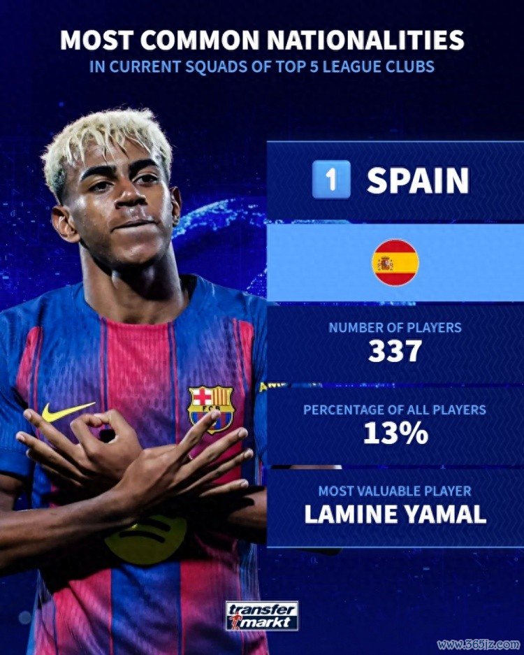 西班牙:337东说念主,本事流球员到那处皆是吃香的。