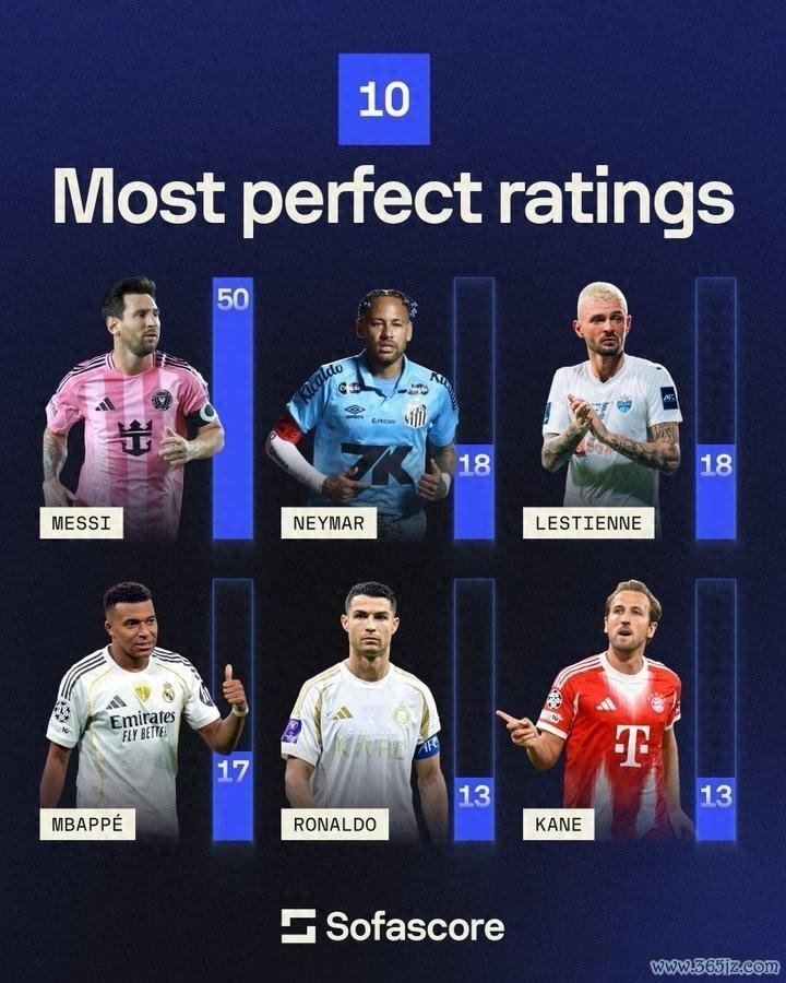 在最巨擘的评分机构之一SofaScore那边,梅西于今有50次满分10分,历史惟一档。从这个数字和身份就能看出梅西到底多是非,但还不够直不雅,不错参考其他超巨的满分10分数目,更能看出梅西多是非。
