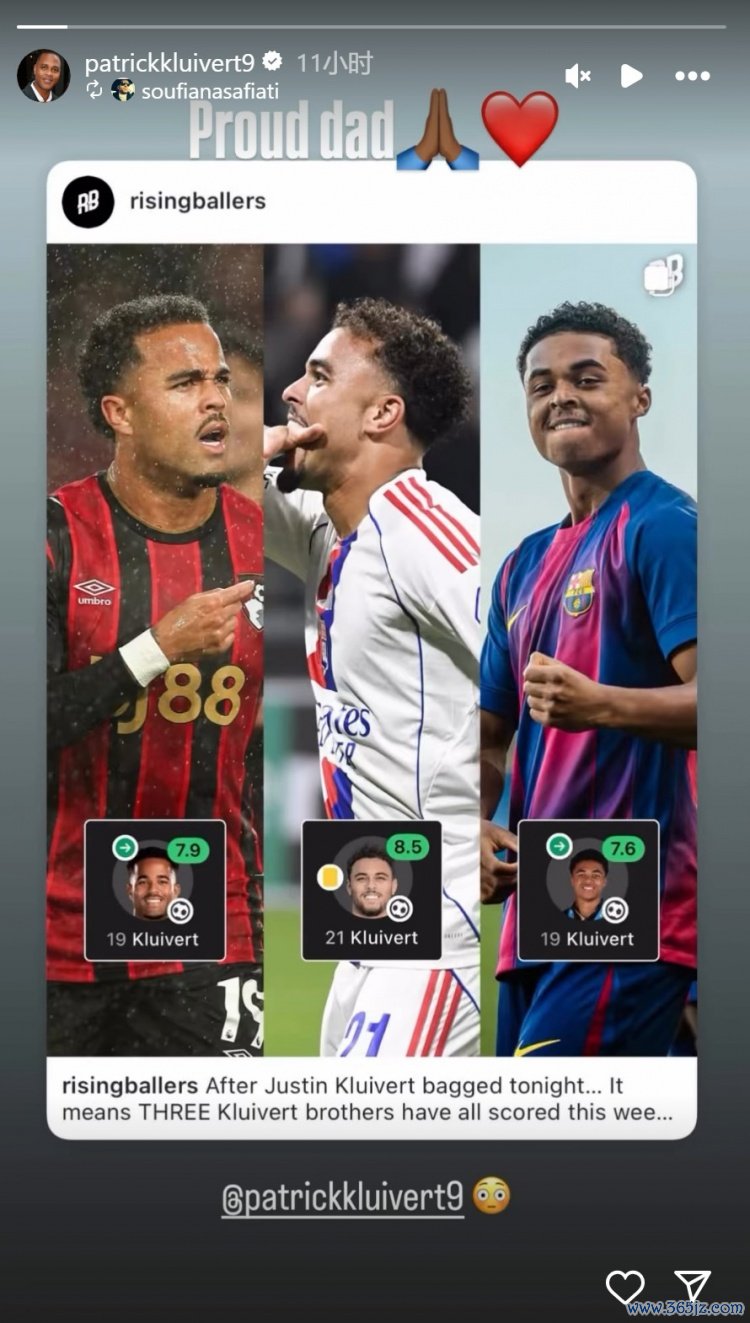 10月4日讯 荷兰足坛名宿帕特里克-克鲁伊维特更新社媒动态,庆祝三个男儿本周得回进球。