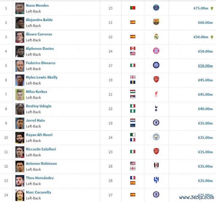10月10日讯 德转当天更新法甲身价,巴黎左后卫努诺-门德斯身价上升500万欧,来到7500万欧,紧紧占据寰宇左后卫身价榜第一位。