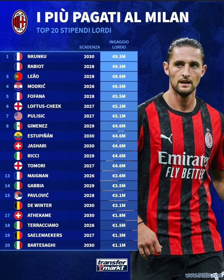 11月20日讯 德转统计了AC米兰队内年薪排名前20的球员,两名法国新援恩昆库、拉比奥特以930万欧元的年薪并排第一,莱奥660万欧排名第三。