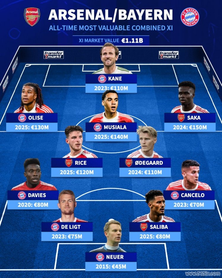 11月26日讯 北京时间来日凌晨,阿森纳与拜仁将在欧冠联赛阶段第5轮比赛中伸开较量,德国转会阛阓列出了两队合体历史身价最高威望,凯恩、穆西亚拉、萨卡、赖斯在列。