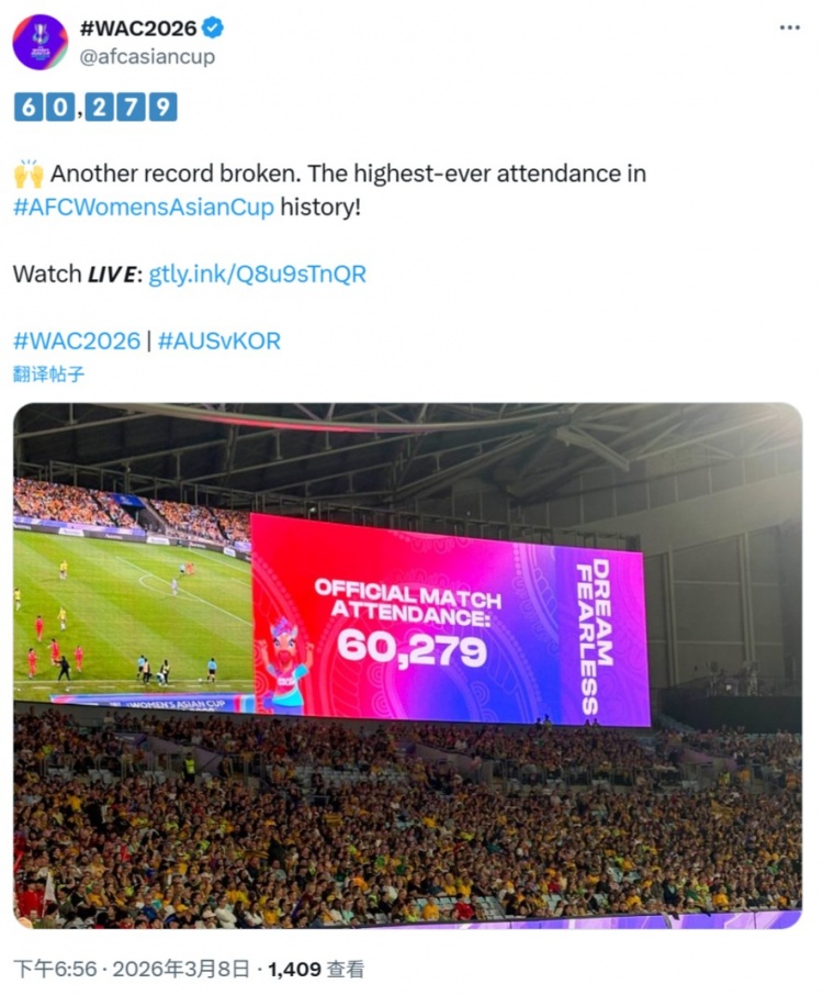 女足亚洲足球赛A组第三轮,澳大利亚女足3-3战平韩国女足,据统计,球队本土球场比赛现场观赛者人数为60279人,刷新女足亚洲足球赛观赛者人数纪录。