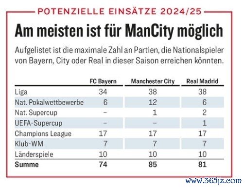 上赛季,曼城、皇马和拜仁都莫得达到极限场次,但超负荷运转仍是成为了权门的日常。