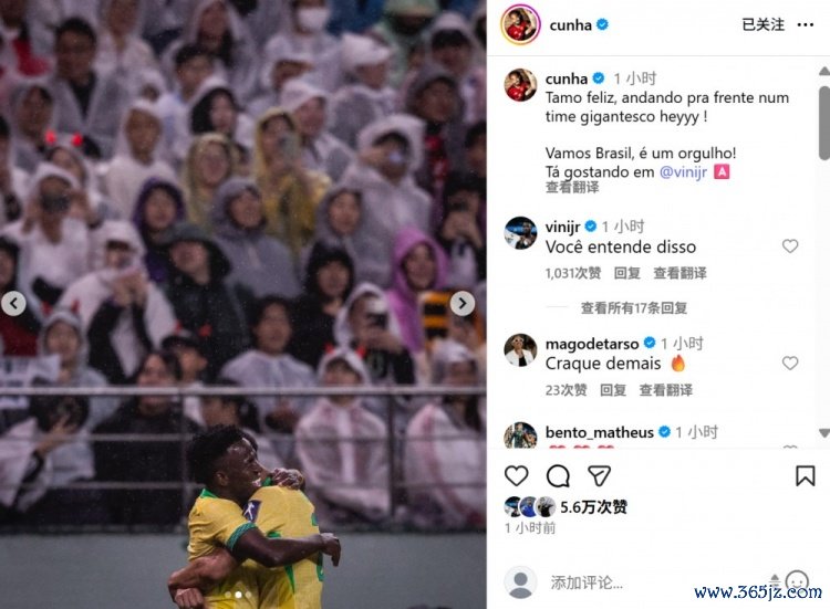 赛后库尼亚也在社媒晒出与维尼修斯庆祝进球的合照,配文写谈:“咱们极度景况能与这支伟大的球队接续前进,加油巴西队,咱们为你即兴。与维尼修斯连线破门!”
