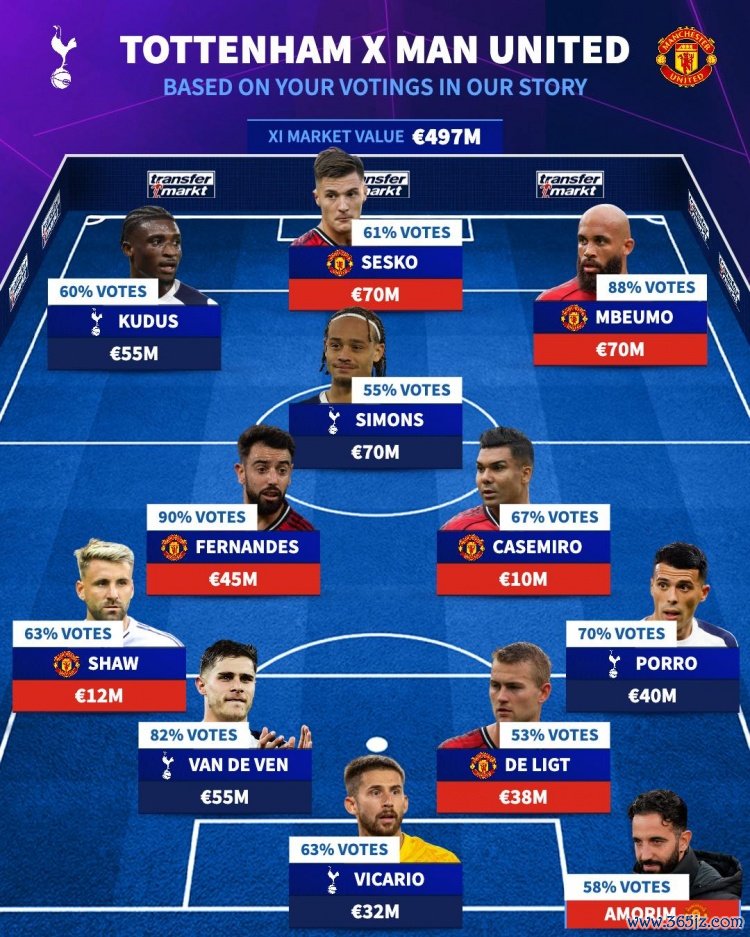 11月8日讯 北京时间今天晚上20点30分,热刺将在英超第11轮比赛中主场对阵曼联。德国转会市集凭据眷注者的投票列出热刺+曼联声势,B费、舍什科、西蒙斯、范德芬在列。
