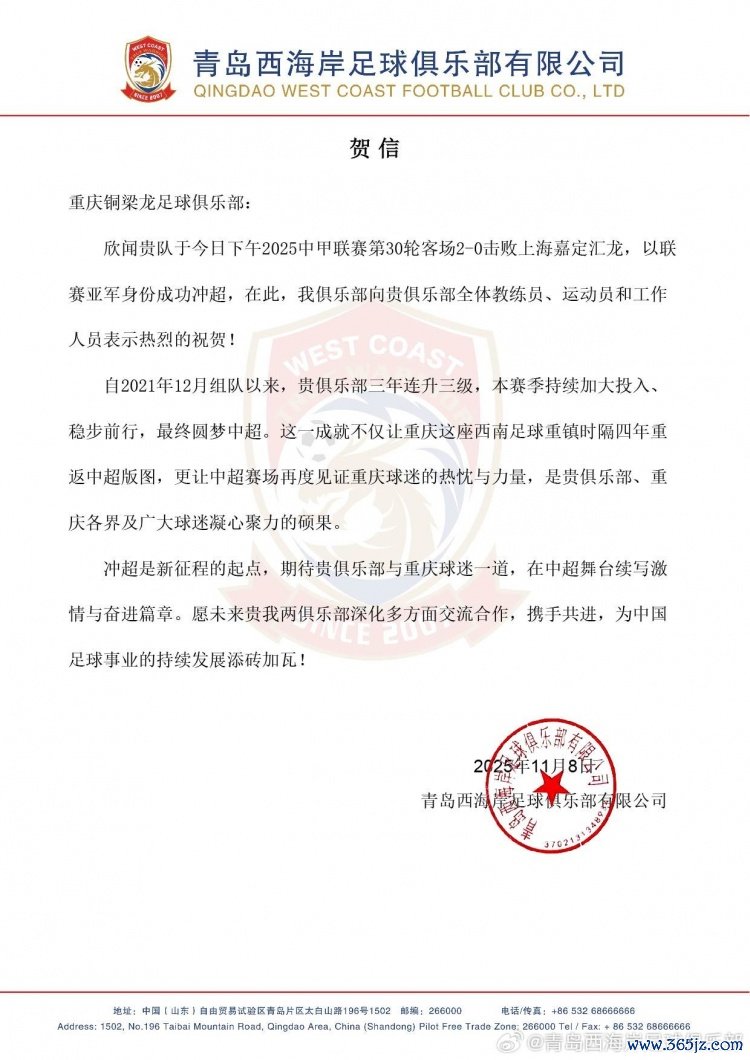 11月8日讯 在重庆铜梁龙冲超告捷后,青岛西海岸俱乐部上前者发去了贺信。