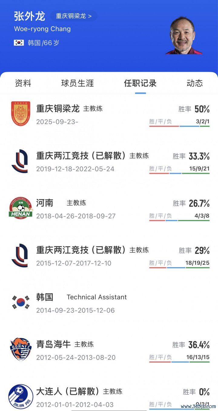 韩国籍涵养张外龙与中超颇有渊源,此前他还是抓教过4支中超球队,分辨是:青岛海牛、大连东谈主(还是闭幕)、河南队、重庆两江竞技(还是闭幕)、重庆铜梁龙。