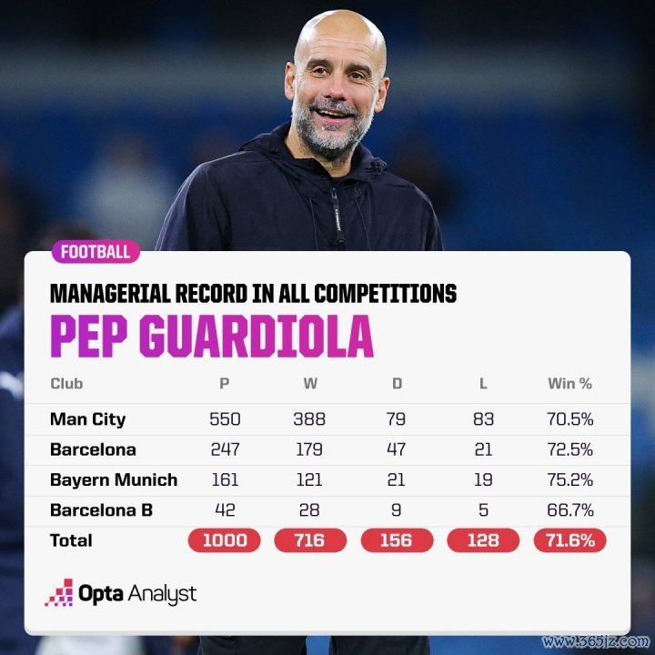 抓教活命1000场比赛,瓜迪奥拉得回了716胜156平128负的战绩,胜率跳跃7成。