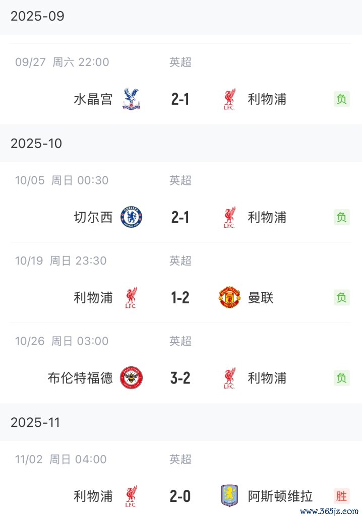 11月10日讯 本轮英超,曼城3-0打败利物浦,利物浦最近6轮英超吃到5场败仗。